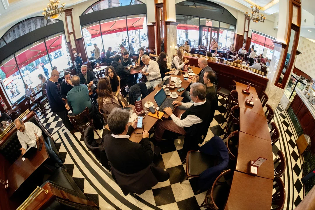 A raíz de las restricciones, la prensa acreditada se dio cita en un reconocido café del centro porteño ubiado a pocos pasos de Plaza de Mayo.