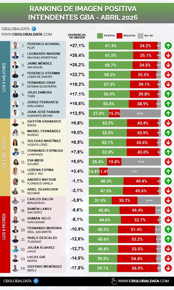 Así, en la parte superior del podio aparecen tres intendentes bonaerenses con diferenciales positivos superiores a los 26 puntos, lo que señala una base de apoyo relativamente consolidada en sus distritos, donde los vecinos valoran la cercanía territorial y la gestión cotidiana.