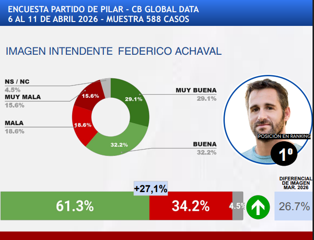 En ese marco, los intendentes bonaerenses de Pilar, Federico Achaval (61,3% vs 34,2%), Malvinas Argentinas, Leonardo Nardini (61,5% vs 35,1%), y San Miguel, Jaime Méndez (60,7% vs 34,5%), lideran el podio de los mejores posicionados.