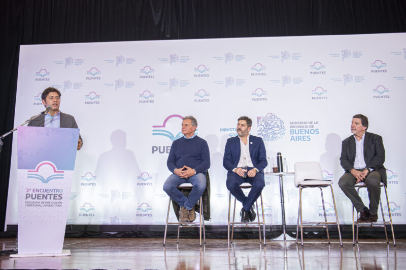 El gobernador de la provincia de Buenos Aires, Axel Kicillof, encabezó este viernes junto al ministro de Gobierno, Carlos Bianco, el panel de cierre del 3° Encuentro Anual del Programa Puentes en el Gran Hotel Provincial de Mar del Plata. Allí, con la presencia del director general de Cultura y Educación, Alberto Sileoni; la jefa de Asesores, Cristina Álvarez Rodríguez, y el diputado Gustavo Pulti, anunció nuevo financiamiento y firmó convenios para ampliar el alcance y la oferta académica del nivel superior en el interior bonaerense.