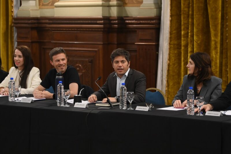 El gobernador de la provincia de Buenos Aires, Axel Kicillof, encabezó este lunes una reunión con artistas y referentes de la cultura en el Salón Dorado de la Casa de Gobierno. Fue junto al ministro de Producción, Ciencia e Innovación Tecnológica, Augusto Costa; las subsecretarias de Promoción Sociocultural, Lorena Riesgo; y de Políticas Culturales, Victoria Onetto; y el director del Teatro Argentino, Ernesto Bauer.