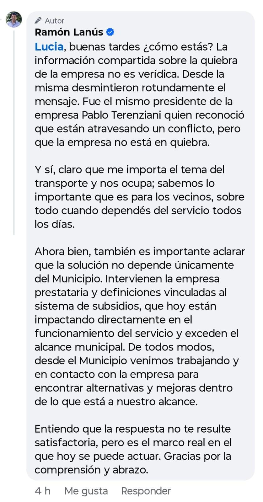 Pregunta de vecina y Respuesta del Intendente Ramón Lanus