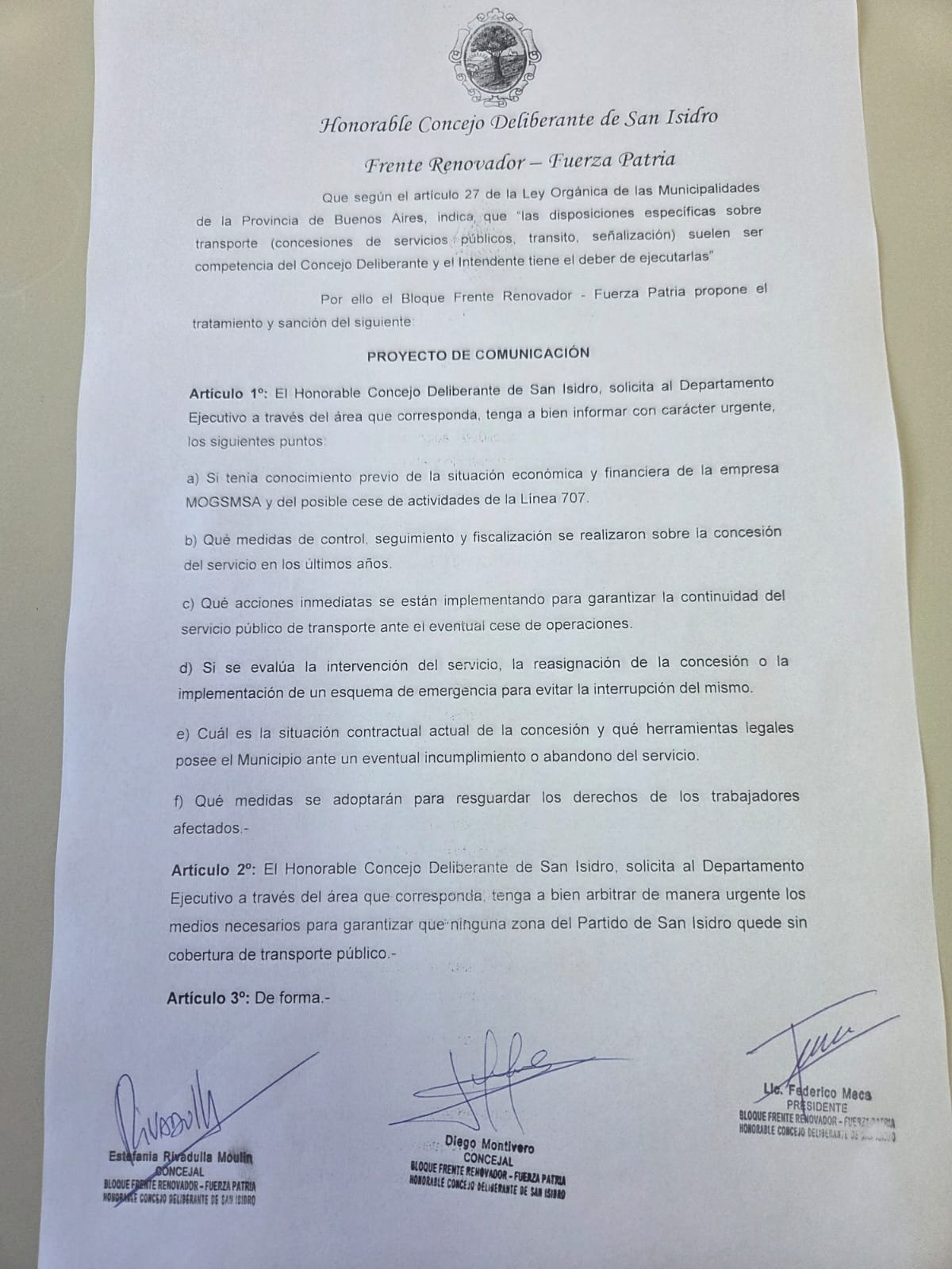 Proyecto presentado por Concejal Federico Meca y otros del Bloque