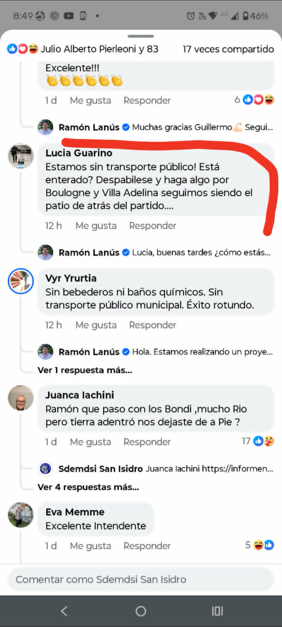 No obstante, el calvario de los vecinos viene de lejos. La eliminación del Ramal 8 y las modificaciones arbitrarias en el recorrido del “Rojo” ya habían dejado a vastos sectores de Villa Adelina y Boulogne en un estado de virtual aislamiento. El impacto social es profundo: estudiantes del Instituto Cervantes, el Juan XXIII, el San Avelino y la Media 2 han perdido su principal medio de transporte, afectando el derecho básico a la educación y la movilidad laboral.