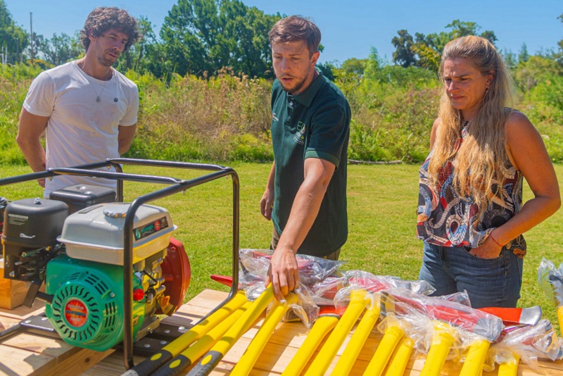 10 cascos Gallet F2 amarillos; 10 hachas de Bombero grandes; 10 rastrillos segadores; 10 herramientas Pulaski (hacha y azada combinadas); 3 mangueras de 30 m. Wildcat con acoples Storz; 1 motobomba forestal con manifold; 40 guantes forestales talle XL; 2 boquillas Protek 307 forestales de 1 pulg. y 2 boquillas Protek 309; 2 boquillas niebla ABS de 1 pulg. y 9 adaptadores de 1 pulg. Storz a rosca BSP.